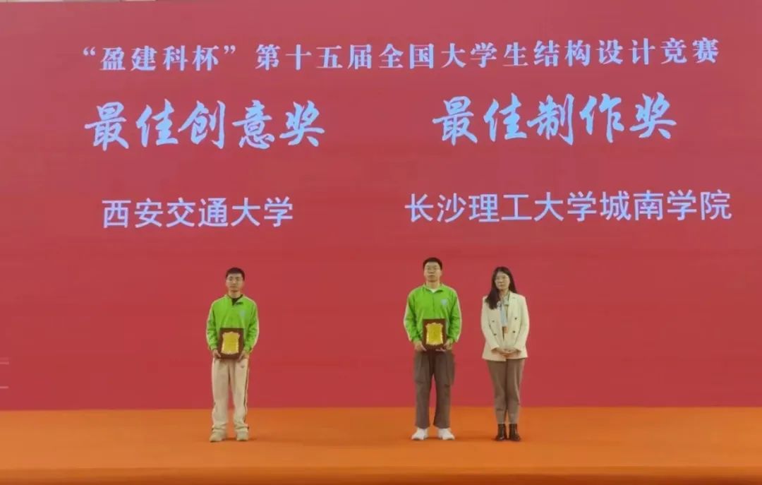 3月23日-26日,第十五届全国大学生结构设计竞赛在太原理工大学举行。经16小时现场模型制作、陈述答辩、模型加载等环节激烈比拼,长沙理工大学两支代表队脱颖而出包揽冠亚军,分别斩获特等奖和一等奖,实现连续八届蝉联该项赛事国赛一等奖。长沙理工大学城南学院代表队作品荣获大赛“最佳制作奖”,长沙理工大学荣获大赛“优秀组织奖”。